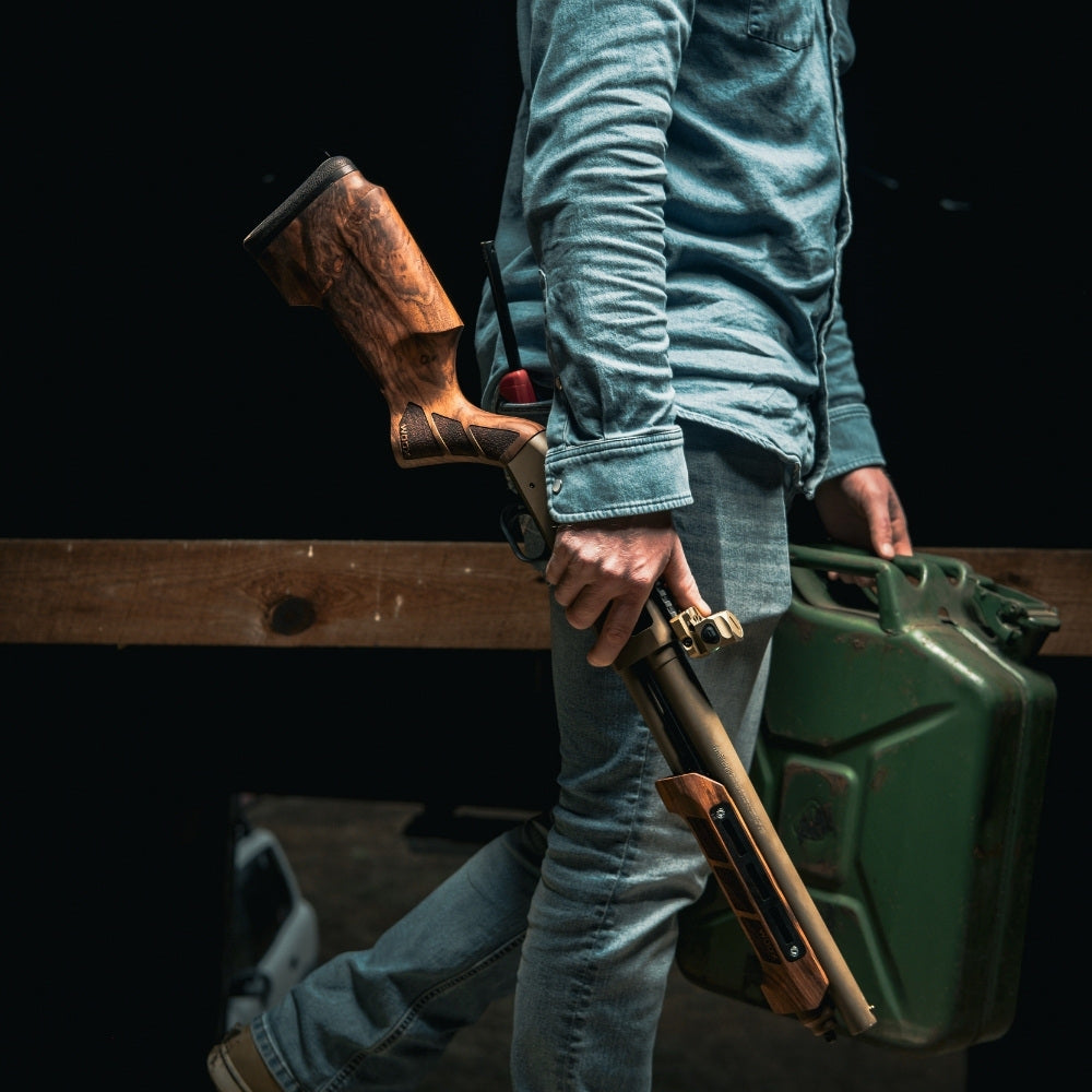 Every WOOX stock is one of one—cut from American walnut whose grain, figure, and density can’t be replicated. We don’t mold, we select—then shape and finish each piece by hand, the same way our family has worked since 1937.