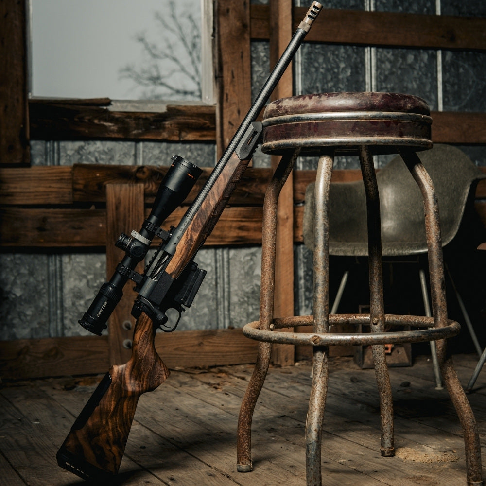 The Superleggera, translating to "Super Light," revolutionizes the standard for lightweight performance, tipping the scales at 35 oz. It harmoniously integrates the timeless beauty of American walnut with the robustness of modern, carbon-reinforced SLS material. The V-Block Bedding Mini Chassis fortifies this union, promising durability and precision. SuperLeggera has been tested .278 MOA improving more than .3 MOA the factory stock accuracy.