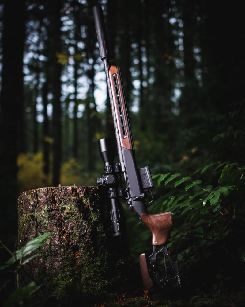 Precision-engineered for long-range shooting with a sophisticated wooden exterior and robust internal chassis core.